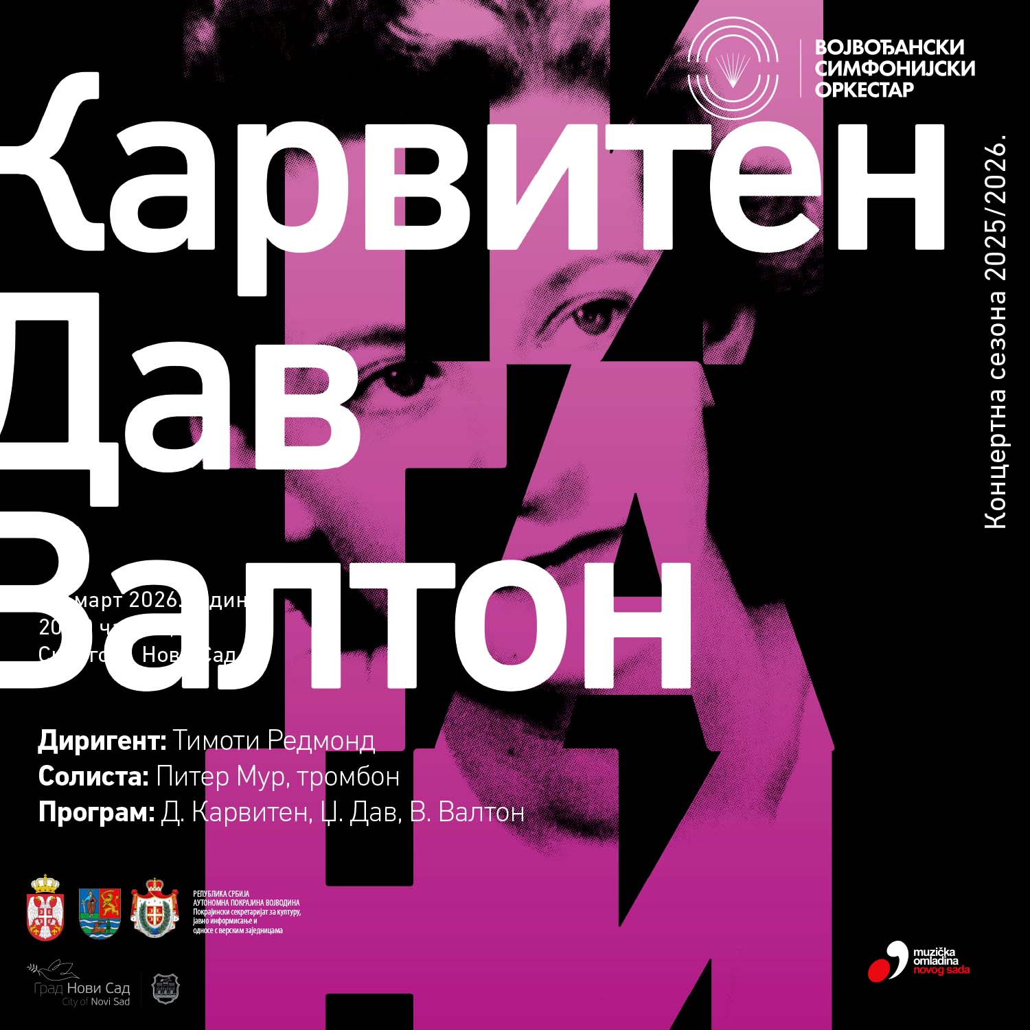 Sinagoga Jevrejska 11, Novi Sad, SerbiaConductor: Timothy RedmondSoloist: Peter Moore, trombone Programme:D. Carwithen: Overture ODTAA (1945)J. Dove: Concerto for Trombone and Orchestra Stargazer (1999)W. Walton: Symphony No. 1 (1929) The Vojvodina Symphony Orchestra continues its 2025/26 concert season, shaped by the motto “Titans – Classical Power Reimagined,” with a concert to be held on Thursday, March 26 at 8:00 PM...